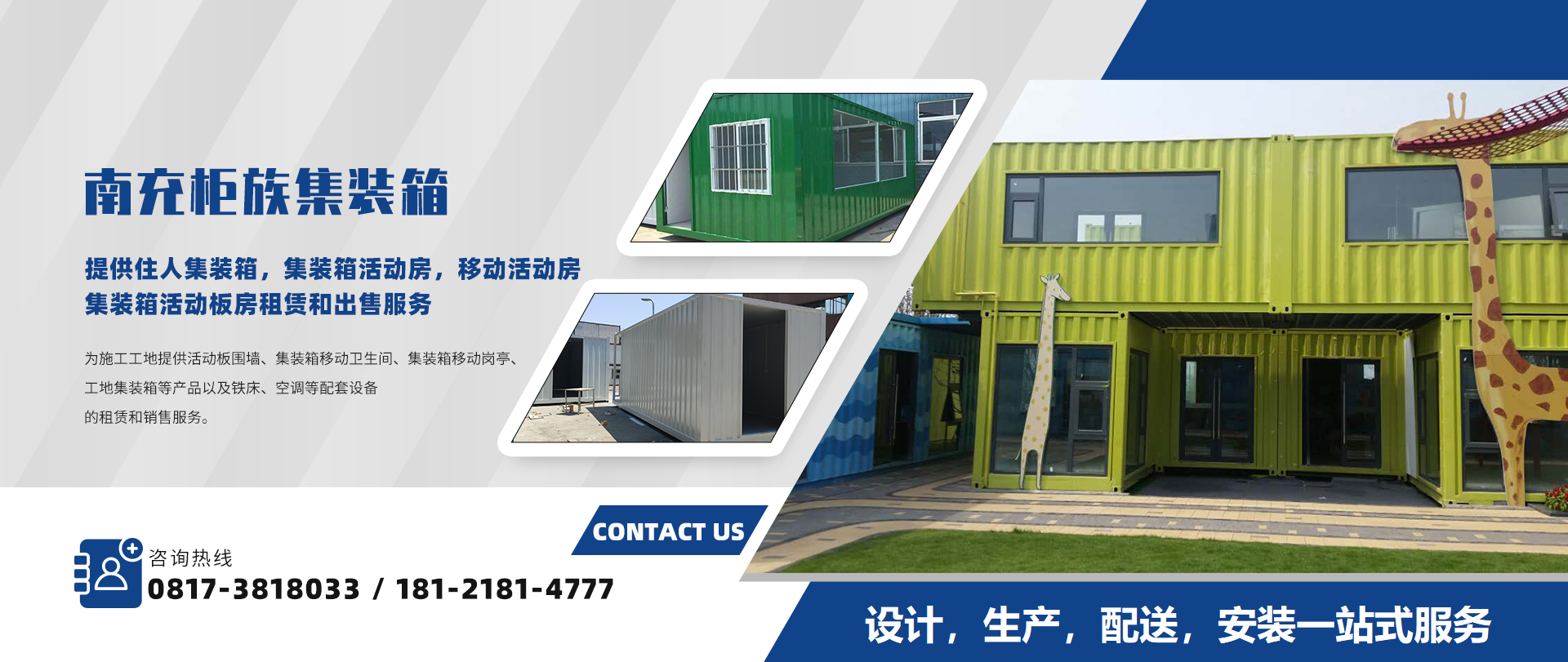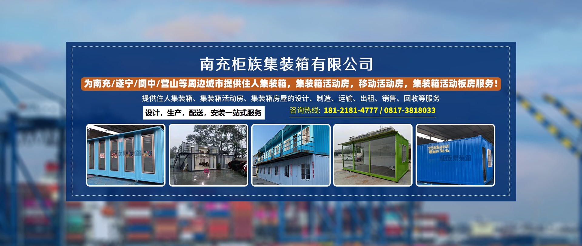 南充柜族集裝箱有限公司是一家為南充/遂寧/閬中/營山/蓬安/南部/西充等周邊城市提供住人集裝箱,集裝箱活動房,移動活動房,集裝箱活動板房服務!本公司專業服務南充住人集裝箱、南充移動活動房、南...